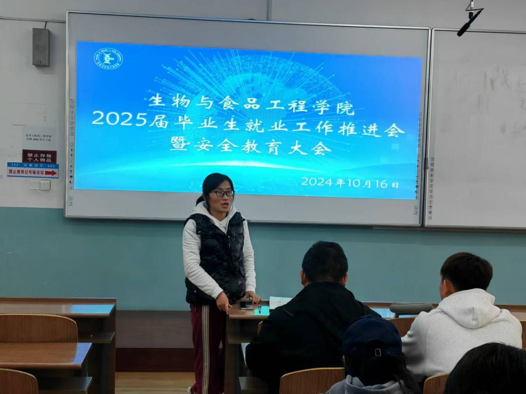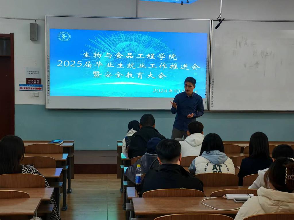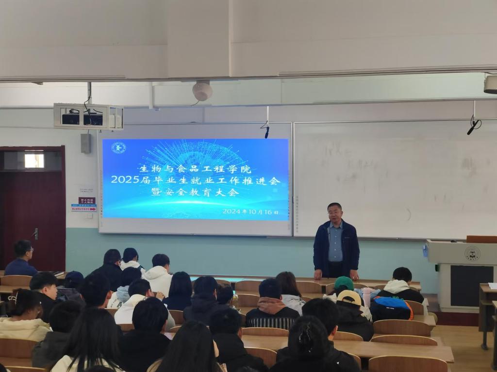 为进一步推进2025届毕业生就业工作,确保学生高质量充分就业,同时保障学生安全,生物与食品工程学院于2024年10月25日在1教109教室召开“2025届毕业生就业工作推进会暨安全教育大会”,学院院长张元新、党委副书记孙京南、副院长张仁文、学办主任裴林及2025届全体毕业生参加此次会议,会议由裴林主持。