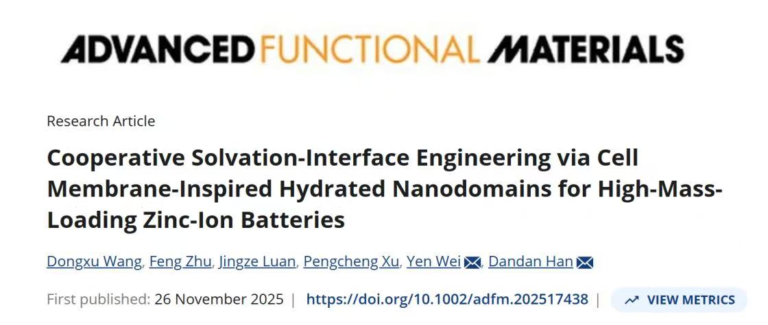 近日,学院韩丹丹教授团队在国际顶尖期刊《Advanced Functional Materials》(中科院一区TOP,IF=19)上发表了题为“Cooperative Solvation-Interface Engineering via CellMembrane-Inspired Hydrated Nanodomains for High-Mass-Loading Zinc-Ion Batteries”(基于细胞膜启发的水合纳米域的协同溶剂化界面工程用于高负载量锌离子电池)的研究论文。该期刊在功能材料、纳米技术及能源材料等前沿交叉领域具有重要的学术影响力。研究生王冬旭为第一作者,韩丹丹教授与清华大学危岩教授为共同通讯作者,吉林化工大学为唯一通讯单位。