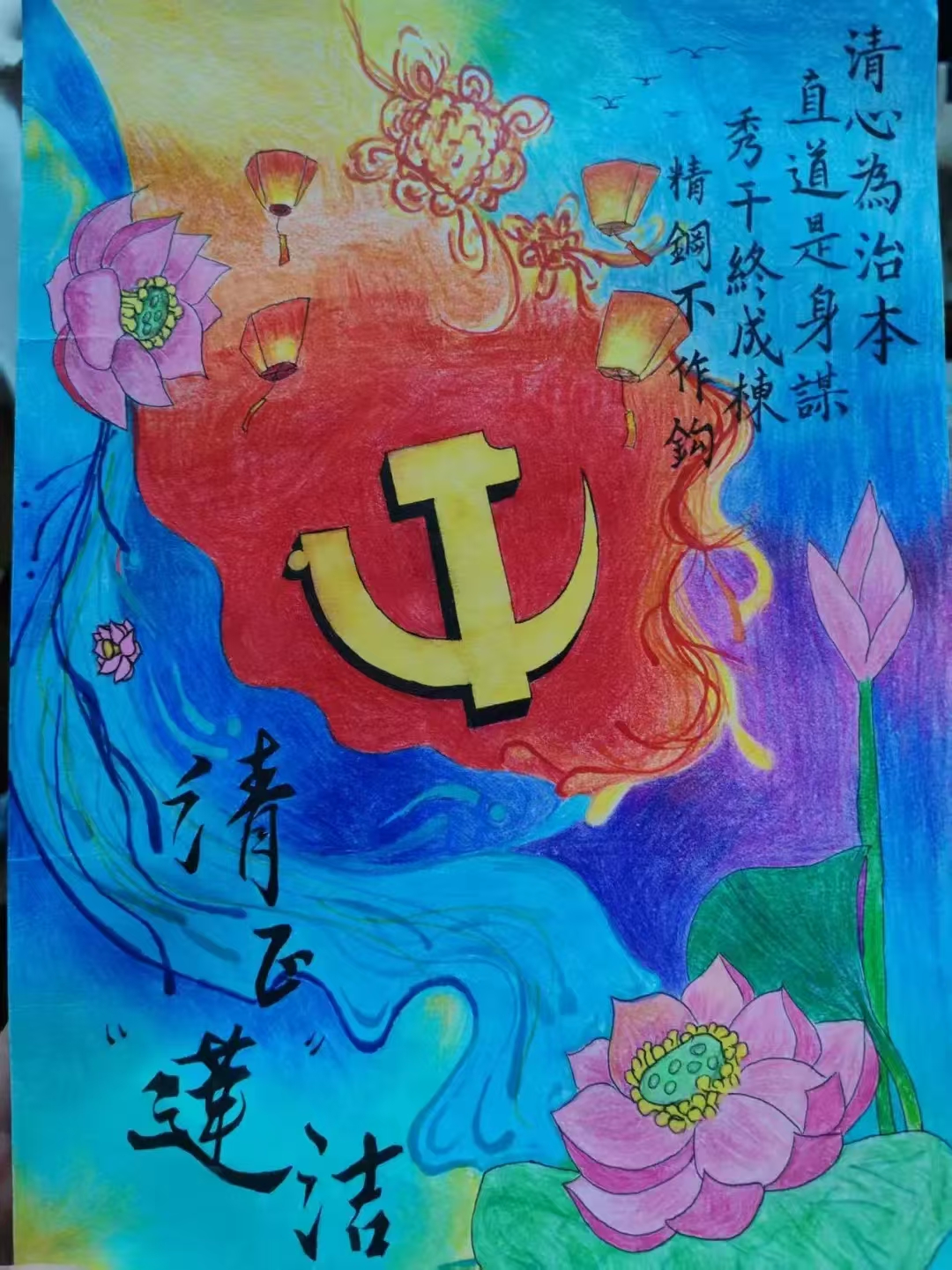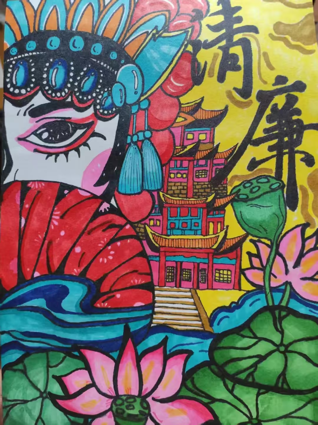 在校园廉洁文化建设浪潮中,生物与食品工程学院学生以笔为媒,用创作传递廉洁精神。绘制水墨荷花的同学,反复晕染花瓣层次,让“出淤泥而不染”的意象跃然纸上。创作牡丹图的创作者,以浓淡相宜的色彩展现繁花盛放;或是用绚丽色彩搭配党徽、廉语,借活泼构图传递廉洁正能量。还有同学将传统戏曲元素融入创作,以鲜明色彩描绘戏曲人物、莲花与古建筑,让廉洁主题在传统文化交融中焕新。这些作品,无论哪种形式,都饱含巧思——把对廉洁的理解,化作灵动线条、斑斓色彩。