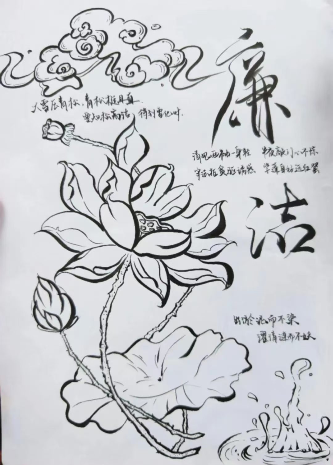 廉洁文化如春风化雨,润物无声。此次廉洁文化作品创作,不仅是一场艺术与思想的碰撞,更是一次崇廉尚洁精神的传承与弘扬。当笔墨勾勒出莲的清雅、竹的挺拔,当文字流淌出廉的正气、洁的风骨,我们看到的是同学们对廉洁文化的深刻诠释与真情表达。期待这些作品能在校园廉洁文化作品展中绽放光彩,也愿这份对廉洁的坚守与追求,如墨香般浸润校园每一个角落,让清风正气长存,让廉洁之花常开!