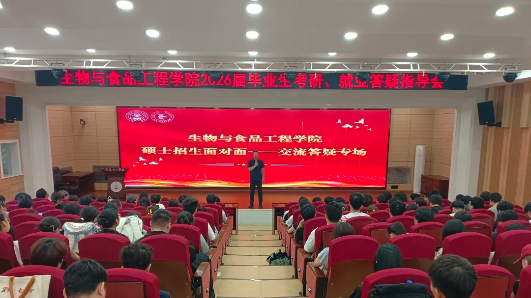 为帮助2026届毕业生明确职业方向,提升就业匹配度与考研成功率,6月12日上午10:00,生物与食品工程学院在图书馆报告厅召开2026届毕业生考研、就业答疑指导会。院长张元新、团委书记卢祉巡出席会议,全体2022级学生参会。会议聚焦学生升学就业困惑,以“明确方向、科学规划、精准发力”为主题,为2026届毕业生提供系统指导与实践建议。